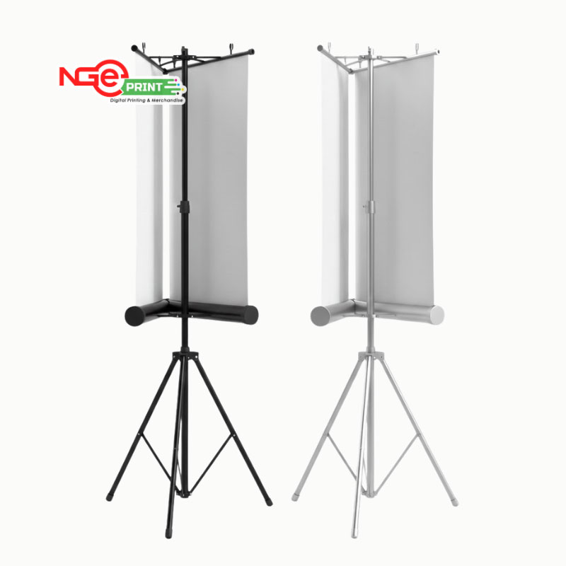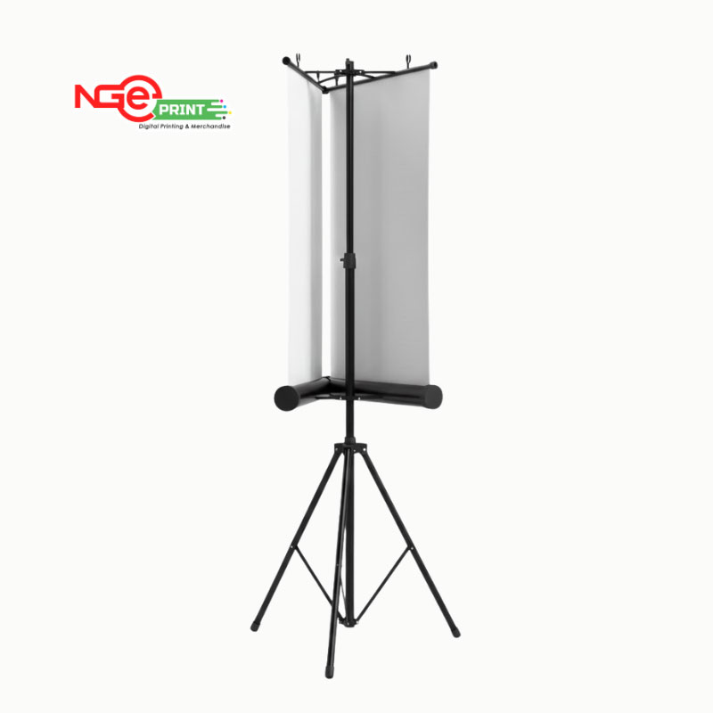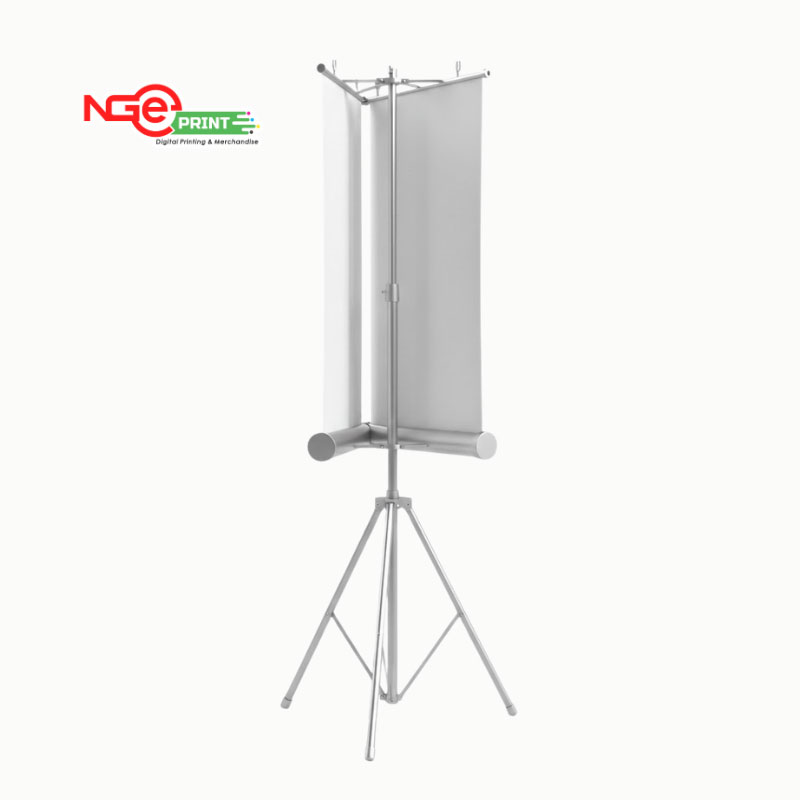Konsepnya sederhana. Satu rangka tripod menopang dua banner sekaligus, kanan dan kiri atau depan dan belakang.